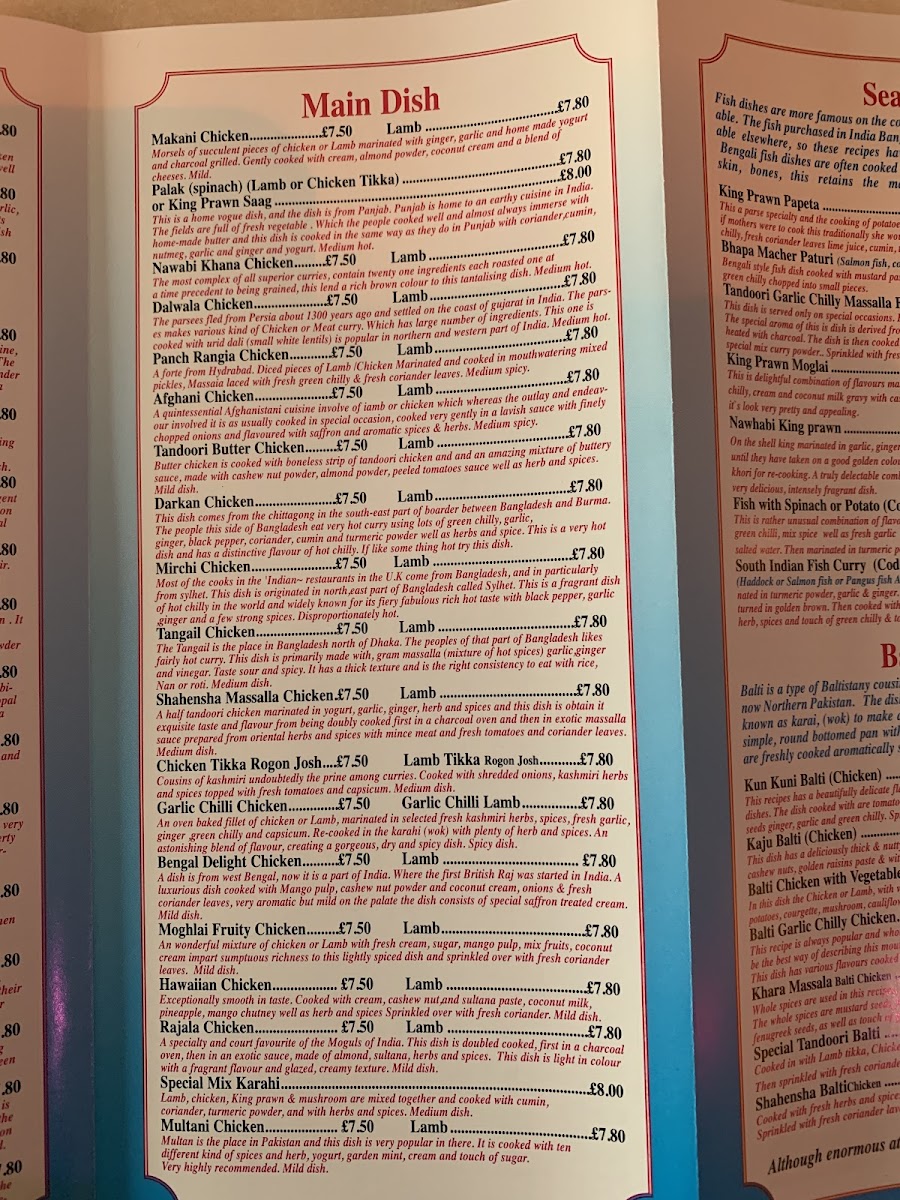 “ Great Indian restaurant Can eat in or take out ,Staff are friendly and welcoming, Menu offers variety of food at afford prices We had a pickle tray and poppadoms, sizzlers starter platter and Chicken Makani with pilau rice, kulcha nan bread was lovely and will be returning :) ”